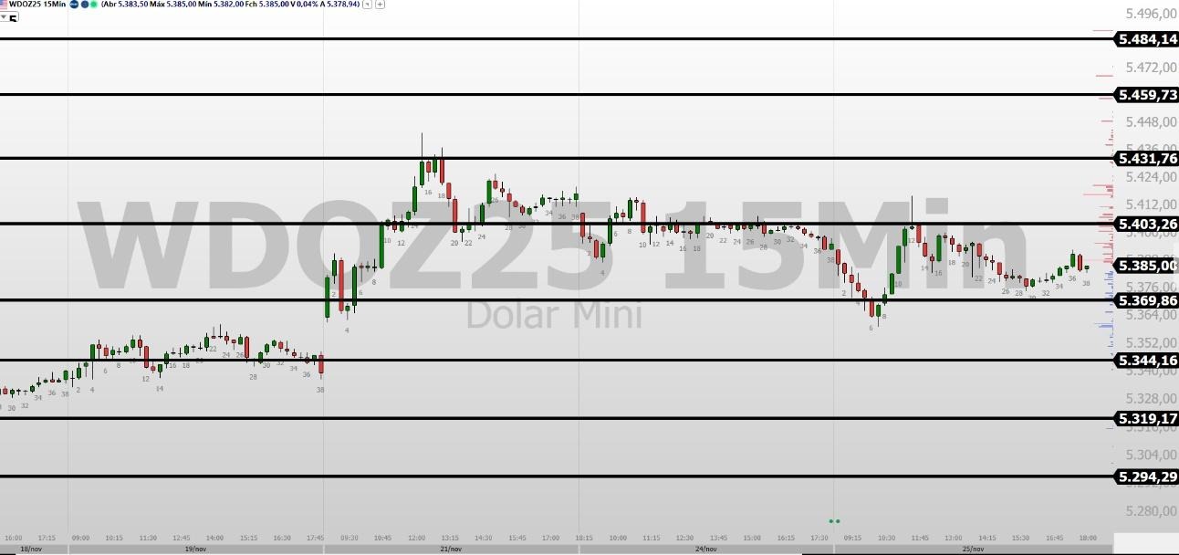 Mini Dólar Futuros com referência do fechamento em 25/11/2025 a máxima 5.415 mínima 5.358 e ajuste 5.378.
