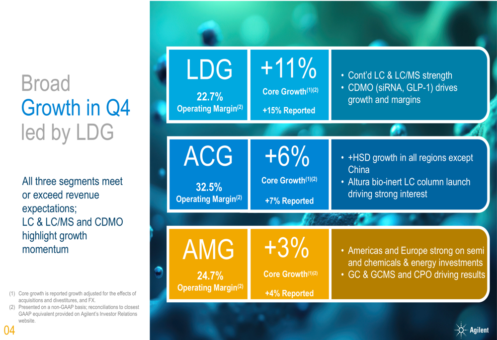 Os segmentos de negócios da Agilent mostraram diferentes graus de força, com todos os três apresentando crescimento base positivo. O segmento Laboratory Development and Growth (LDG) liderou com crescimento base de 11% e crescimento reportado de 15%, apoiado pela força nas linhas de produtos de cromatografia líquida (LC) e LC/MS.