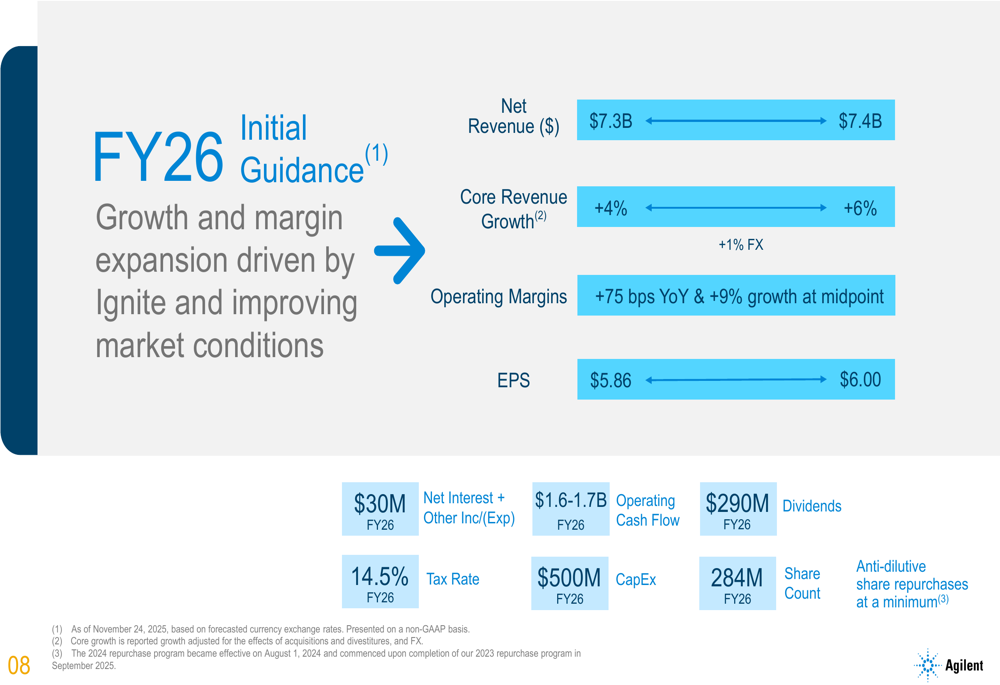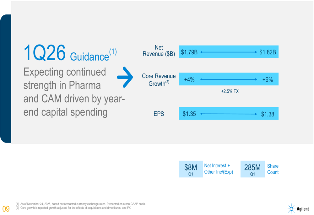 Para o primeiro trimestre do ano fiscal de 2026, a Agilent forneceu a seguinte orientação: