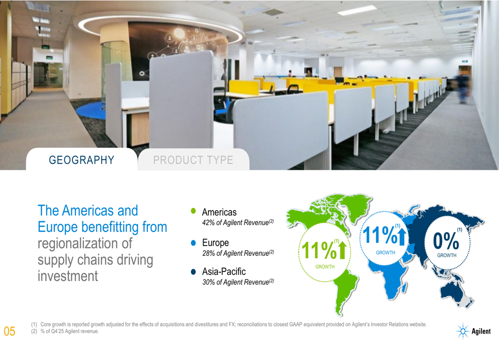 Tanto as Américas quanto a Europa registraram forte crescimento de 11%, representando coletivamente 70% da receita da Agilent. A empresa atribuiu essa força à regionalização contínua das cadeias de suprimentos, impulsionando investimentos nesses mercados. Em contraste, a Ásia-Pacífico, que representa 30% da receita, mostrou desempenho estável com crescimento de 0%, provavelmente refletindo desafios contínuos no mercado chinês.