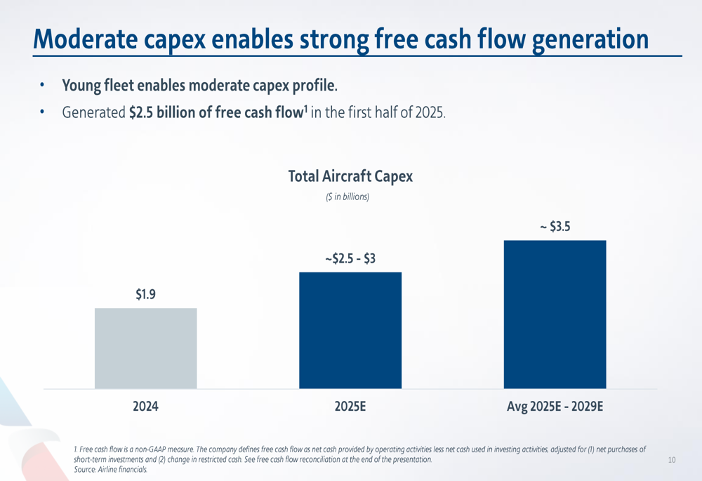 A American Airlines continua se beneficiando de sua frota relativamente jovem, que permite um perfil moderado de despesas de capital e forte geração de fluxo de caixa livre. A empresa gerou US$ 2,5 bilhões em fluxo de caixa livre durante o primeiro semestre de 2025, com despesas de capital em aeronaves projetadas entre US$ 2,5 bilhões e US$ 3 bilhões para o ano completo de 2025.