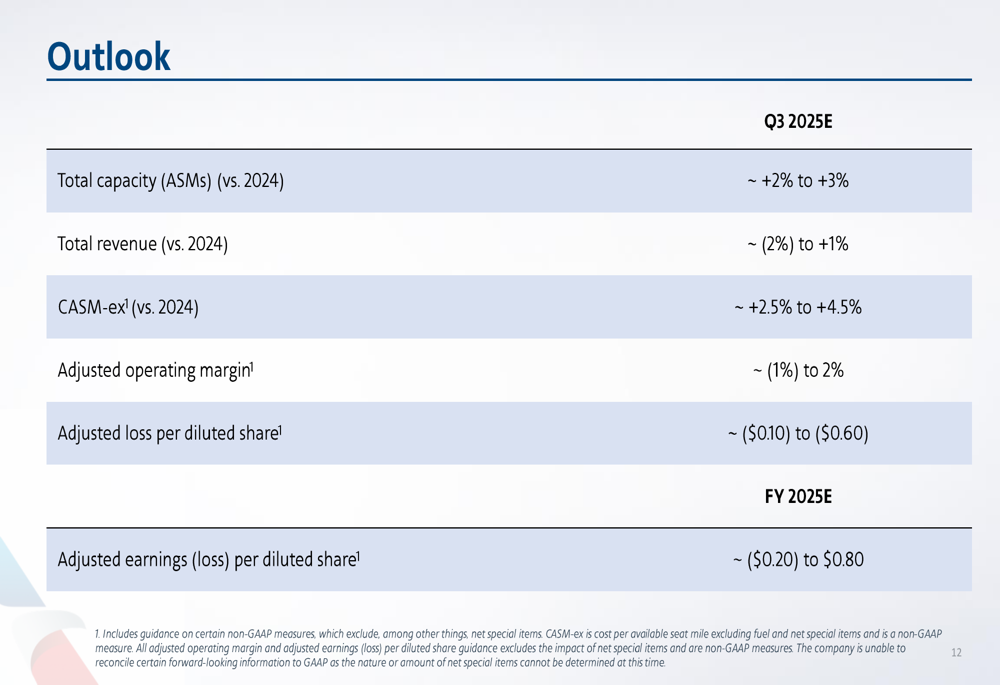 A American Airlines forneceu uma perspectiva cautelosa para o terceiro trimestre e para o ano completo de 2025. Para o 3º tri de 2025, a empresa espera que a capacidade total aumente de 2% a 3% em relação ao ano anterior, enquanto a receita total está projetada para variar de uma queda de 2% a um aumento de 1% em comparação com o 3º tri de 2024. O custo por assento-milha disponível, excluindo combustível e itens especiais (CASM-ex), deve aumentar de 2,5% a 4,5%, com margem operacional ajustada entre -1% e 2%.