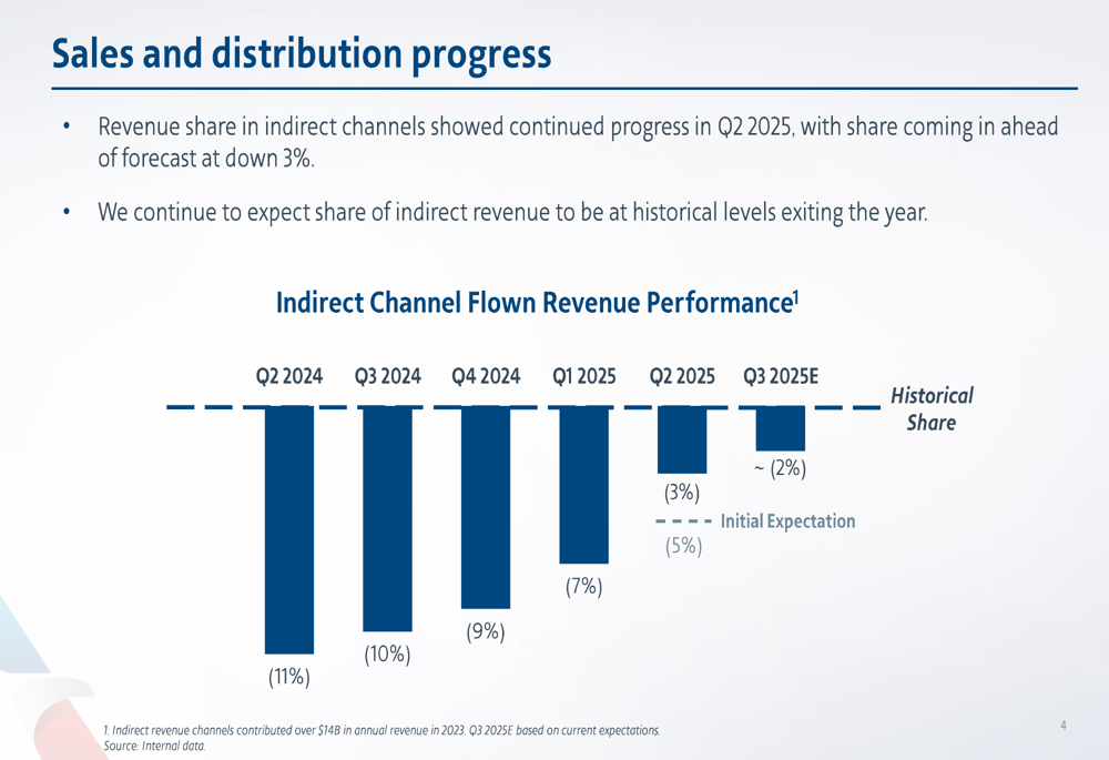 A companhia aérea também está observando uma melhora no desempenho da receita de canais indiretos, com o 2º tri de 2025 mostrando uma queda na participação de receita de apenas 3%, comparada a uma queda inicialmente esperada de 5%. A administração prevê melhoria contínua, com a receita de canais indiretos devendo retornar aos níveis históricos normais até o final do ano.
