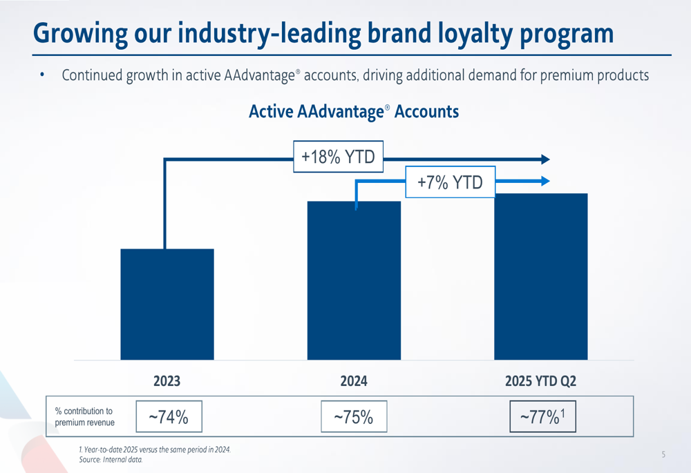 A American Airlines está focada em aprimorar suas ofertas premium e programa de fidelidade para impulsionar o crescimento da receita. O programa AAdvantage continua mostrando forte desempenho, com membros ativos contribuindo com 77% da receita premium no 2º tri de 2025, acima dos 75% em 2024 e 74% em 2023. Isso representa um crescimento de 18% desde o início do ano na contribuição do programa para a receita premium.