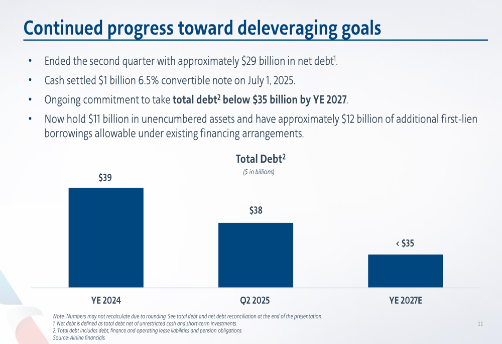 A redução da dívida continua sendo uma prioridade-chave para a companhia aérea. A American encerrou o 2º tri de 2025 com aproximadamente US$ 29 bilhões em dívida líquida, seu nível mais baixo desde o 3º tri de 2015. A empresa recentemente liquidou em dinheiro uma nota conversível de US$ 1 bilhão a 6,5% em 1º de julho de 2025, e mantém seu compromisso de reduzir a dívida total para menos de US$ 35 bilhões até o final de 2027. Adicionalmente, a American possui US$ 11 bilhões em ativos não onerados, proporcionando flexibilidade financeira.