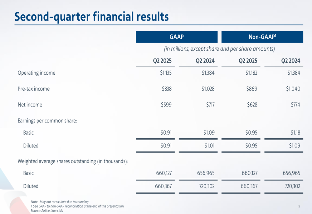 A American Airlines reportou uma receita trimestral recorde de US$ 14,4 bilhões para o 2º tri de 2025, embora seus indicadores de lucratividade tenham mostrado quedas em relação ao ano anterior. O lucro operacional GAAP caiu para US$ 1.135 milhões, comparado aos US$ 1.384 milhões no 2º tri de 2024, enquanto o lucro líquido GAAP diminuiu para US$ 599 milhões, ante US$ 717 milhões no mesmo período do ano passado.