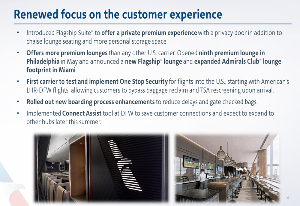 A American está fazendo investimentos significativos em melhorias na experiência do cliente, introduzindo o Flagship Suite para oferecer uma experiência premium privada e mantendo mais lounges premium do que qualquer outra companhia aérea dos EUA. Iniciativas adicionais incluem a implementação do One Stop Security para voos internacionais, melhorias no processo de embarque para reduzir atrasos e a ferramenta Connect Assist no DFW para melhorar as conexões dos clientes.