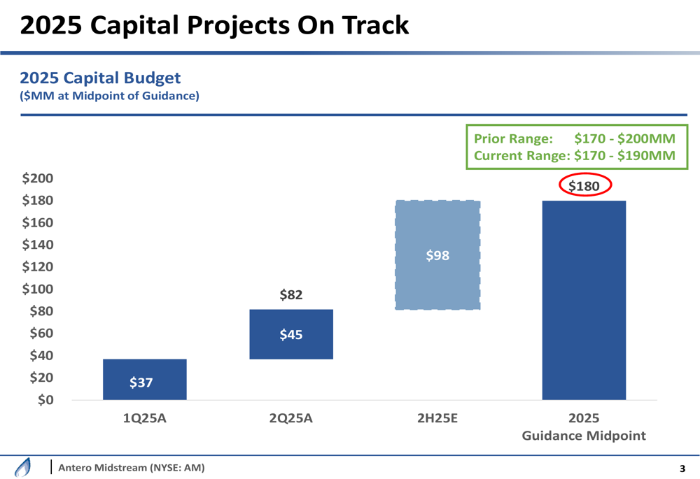 A Antero Midstream demonstrou gestão disciplinada de capital ao ajustar sua faixa de orçamento de capital para 2025 de US$ 170-200 milhões para US$ 170-190 milhões, mantendo o ponto médio de US$ 180 milhões. Isso reflete o foco contínuo da empresa na eficiência de capital enquanto apoia iniciativas de crescimento.