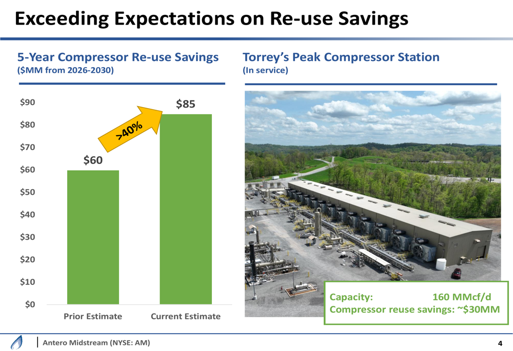 A Antero Midstream destacou seu foco estratégico na eficiência de custos através da reutilização de infraestrutura. A empresa aumentou sua economia projetada de reutilização de compressores para 5 anos (2026-2030) em mais de 40%, de US$ 60 milhões para US$ 85 milhões, demonstrando seu compromisso com a eficiência de capital: