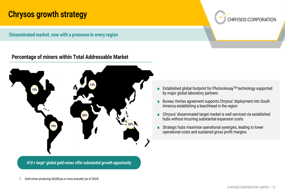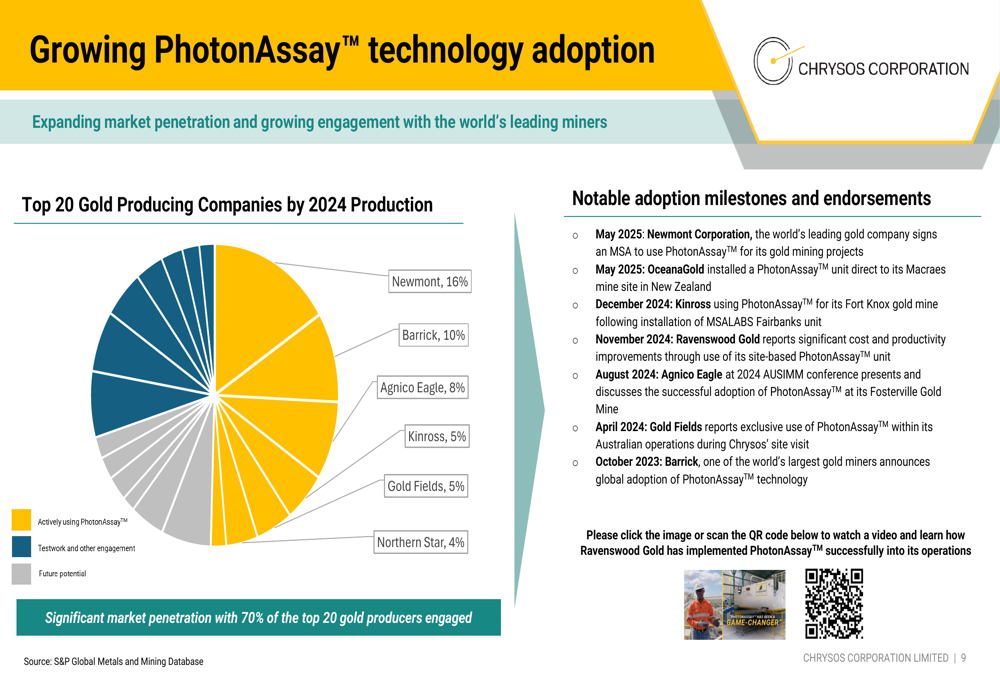 A Chrysos fez avanços significativos com as principais mineradoras do mundo. Entre as 20 maiores empresas produtoras de ouro por produção em 2024, uma porcentagem crescente está ativamente usando a tecnologia PhotonAssay ou envolvida em testes e outras avaliações.