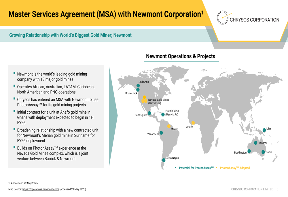 Um desenvolvimento significativo para a Chrysos foi a assinatura de um Acordo de Serviços Master (MSA) com a Newmont Corporation, a principal empresa de mineração de ouro do mundo, anunciado em 9 de maio de 2025. Esta parceria inclui implantações nas minas de ouro Ahafo e Merian da Newmont, com potencial para expansão adicional nas operações globais da Newmont.