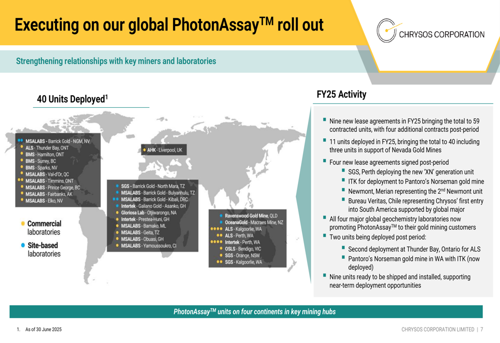 A presença global da empresa continua a expandir, com unidades PhotonAssay agora implantadas em múltiplos continentes. A implantação é categorizada entre laboratórios comerciais e laboratórios baseados em minas, mostrando a capacidade da Chrysos de atender diferentes segmentos de mercado.