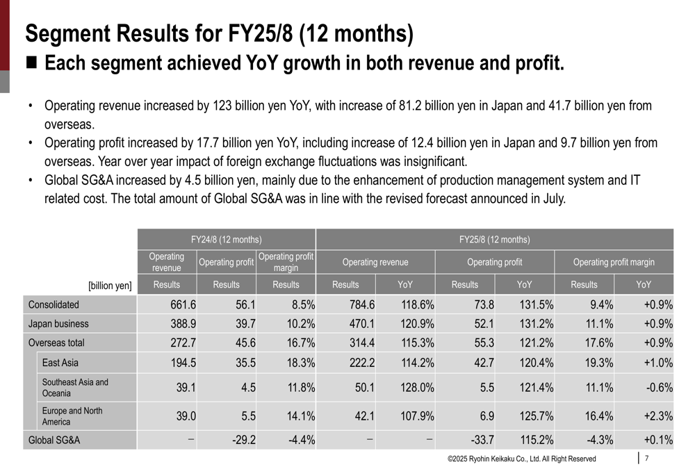 A empresa alcançou recordes em receita operacional e em todos os níveis de lucro para o ano fiscal 25/8, superando o plano revisado anunciado em julho. Vendas fortes nos negócios internacionais, especialmente na China continental, Europa e América do Norte, contribuíram significativamente para esse desempenho. A empresa também observou que sua estratégia de posicionar produtos para cuidados com a pele como uma categoria central global foi particularmente bem-sucedida.