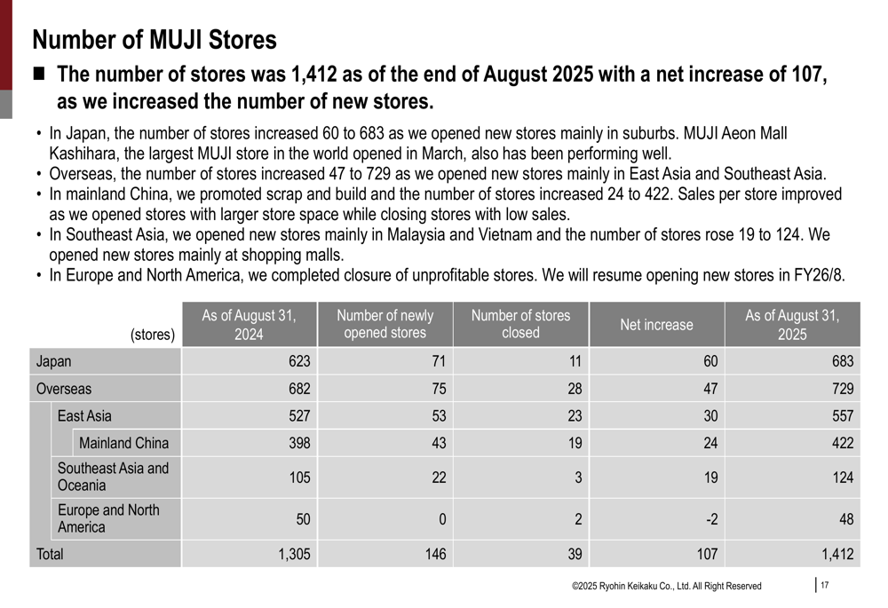 A Ryohin Keikaku continuou sua expansão global, com o número total de lojas MUJI atingindo 1.412 em 31 de agosto de 2025, representando um aumento líquido de 107 lojas em relação ao ano anterior: