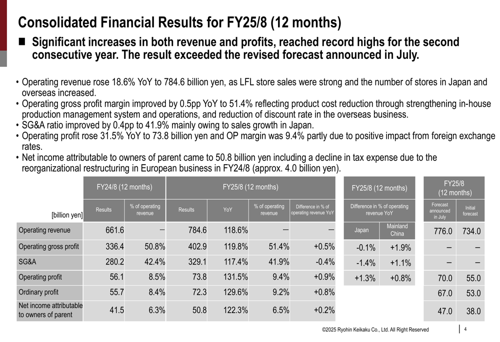 A Ryohin Keikaku relatou que sua estratégia de desenvolvimento de produtos e promoção levou a resultados que superaram as previsões iniciais, com desempenho particularmente forte nos mercados internacionais.