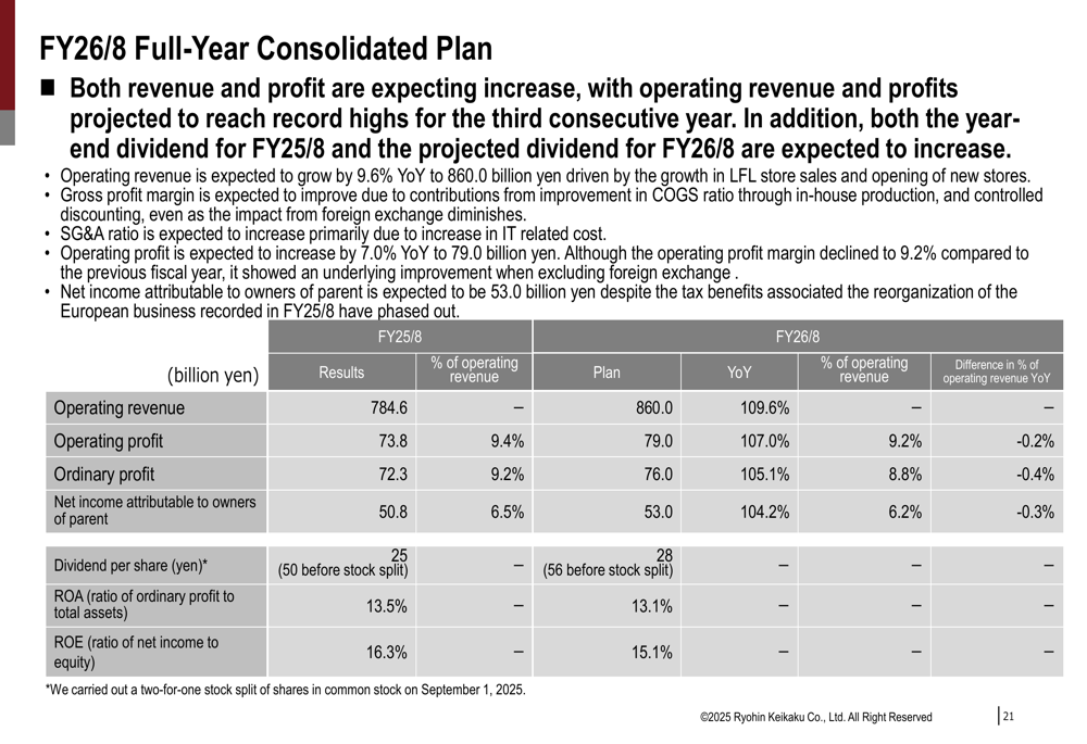 Olhando para o ano fiscal 26/8, a Ryohin Keikaku espera alcançar recordes em receita operacional e lucros pelo terceiro ano consecutivo: