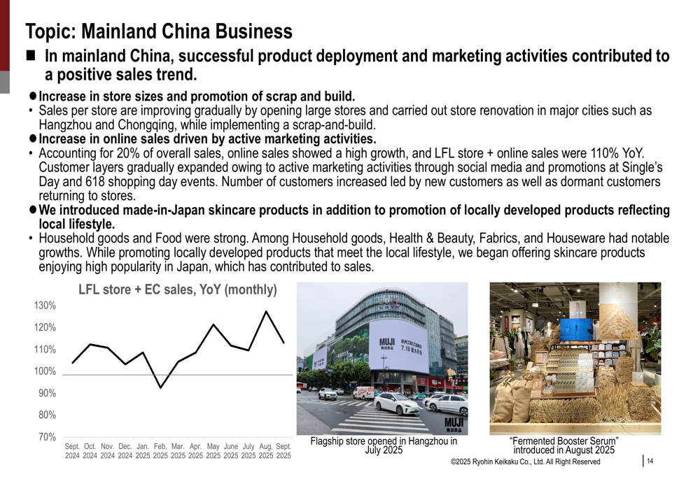 A empresa aumentou o tamanho das lojas na China enquanto implementava uma estratégia de desmontagem e reconstrução para otimizar sua presença no varejo. As vendas online foram impulsionadas por atividades de marketing ativas, e a introdução de produtos para cuidados com a pele fabricados no Japão foi particularmente bem-sucedida. As categorias de produtos domésticos e alimentos mostraram forte desempenho no mercado chinês.
