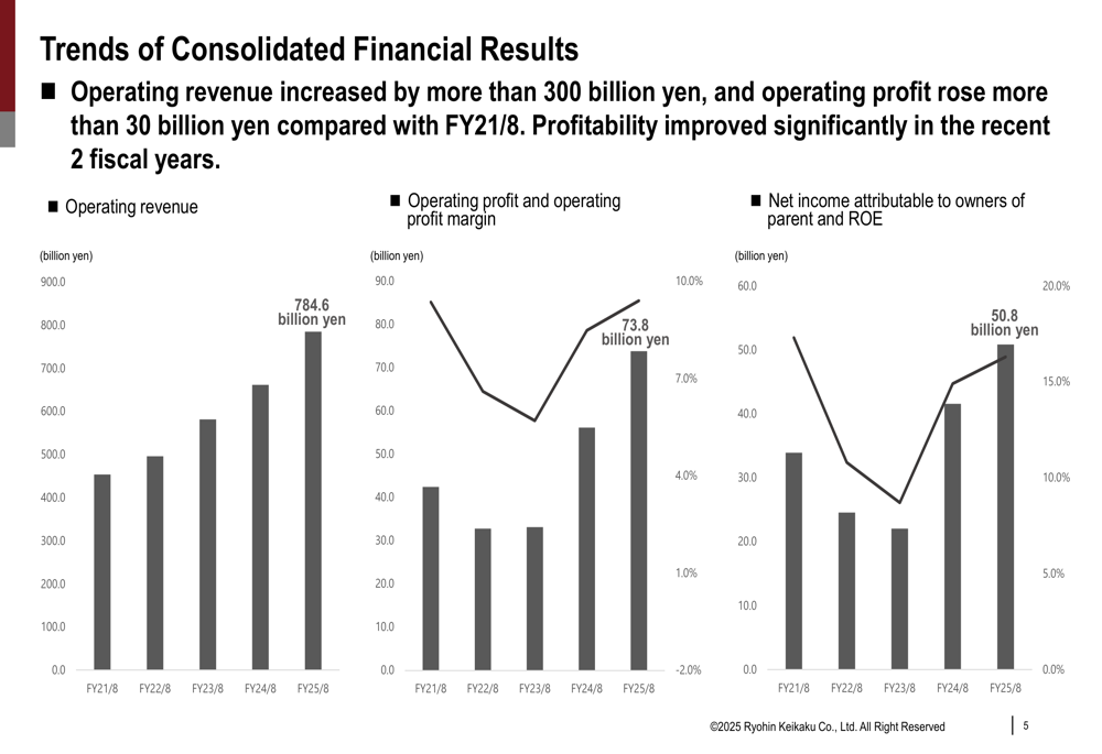 Desde o ano fiscal 21/8, a Ryohin Keikaku aumentou sua receita operacional em mais de 300 bilhões de ienes e seu lucro operacional em mais de 30 bilhões de ienes, demonstrando a eficácia de sua estratégia de expansão e iniciativas de desenvolvimento de produtos.