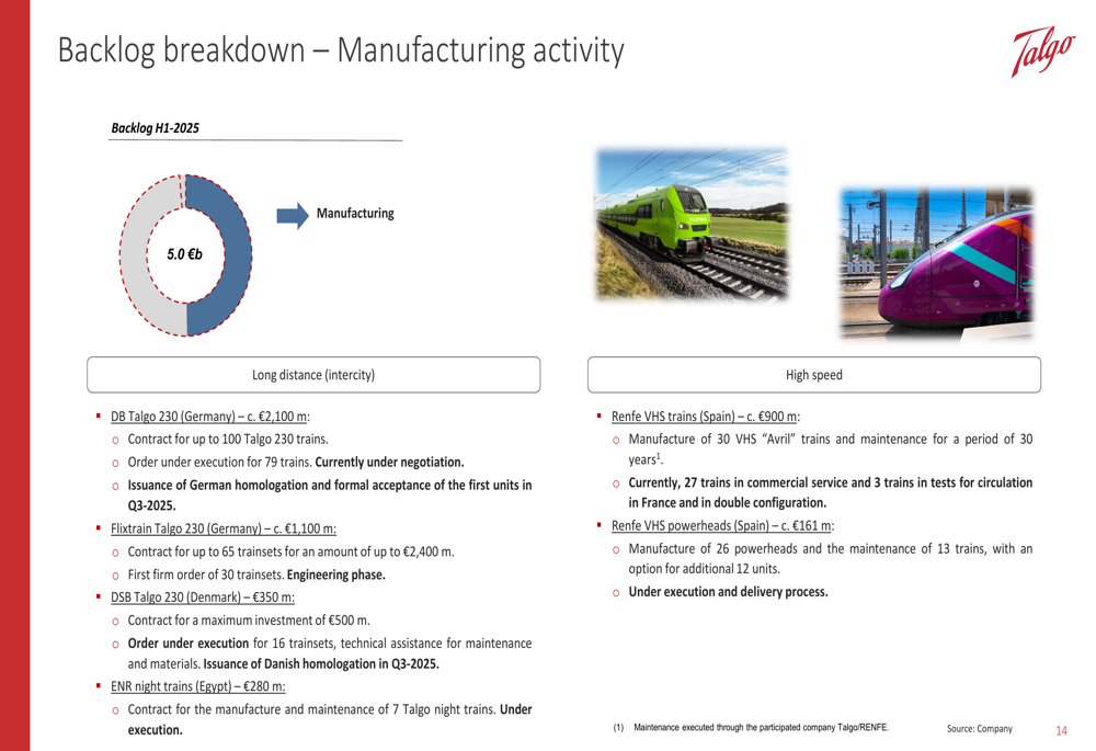 A conquista comercial mais notável foi garantir um contrato da FlixTrain para a fabricação e manutenção de até 65 trens no valor de até €2,4 bilhões, com um pedido inicial firme de aproximadamente €1,1 bilhão. Isso representa o maior contrato da história da Talgo e fortalece significativamente as perspectivas de longo prazo da empresa.