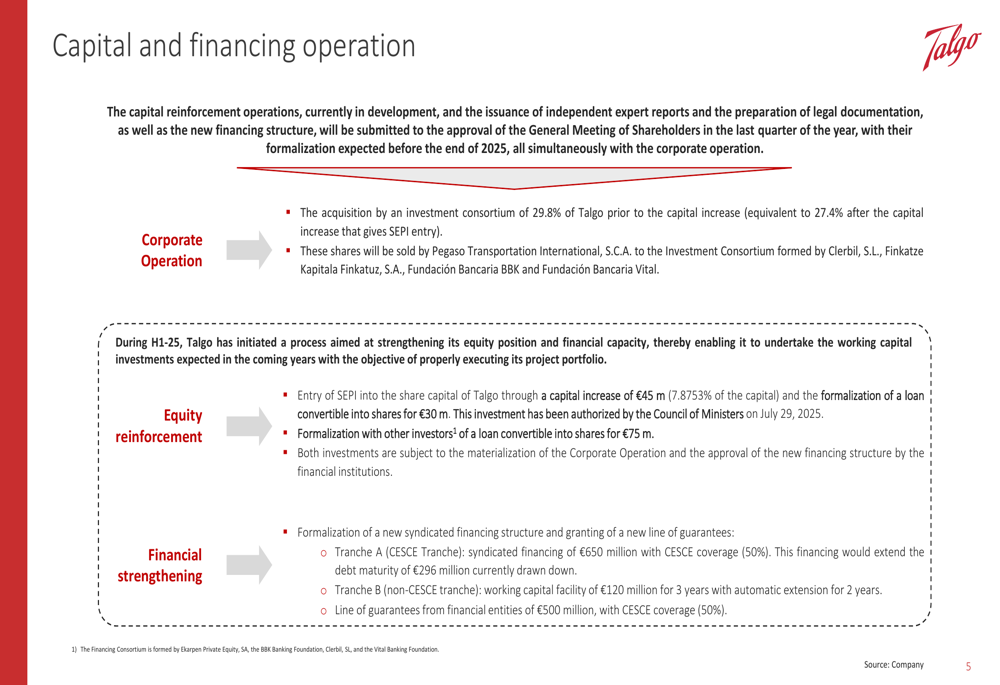 O plano inclui a aquisição de uma participação de 29,8% na Talgo por um consórcio de investimento, seguida por um aumento de capital. Além disso, a SEPI (empresa estatal de participações industriais da Espanha) entrará no capital social da Talgo com um investimento de €45 milhões e fornecerá um empréstimo de €30 milhões conversível em ações, conforme autorizado pelo Conselho de Ministros espanhol em 29.07.2025.