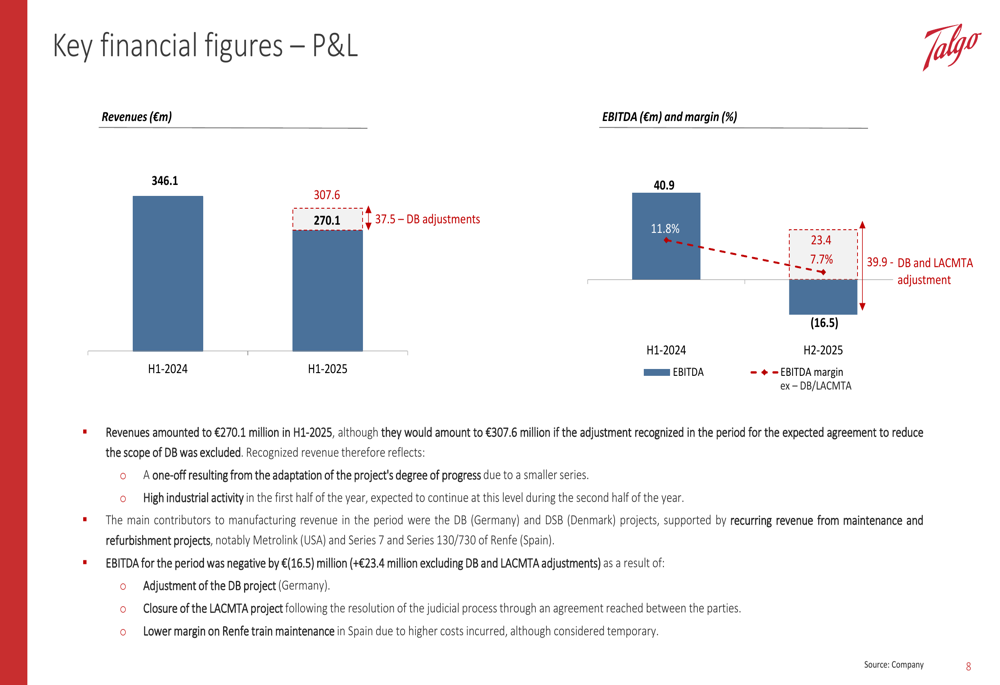O desempenho financeiro da Talgo no primeiro semestre de 2025 mostrou deterioração significativa em comparação com o mesmo período de 2024. A receita diminuiu 22% para €270,1 milhões, embora a empresa tenha observado que, excluindo um ajuste de €37,5 milhões relacionado ao projeto DB, a receita teria sido de €307,6 milhões.