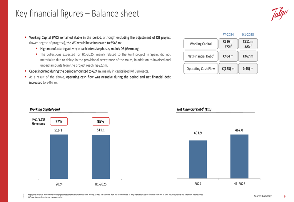 O capital de giro permaneceu elevado em €511 milhões no primeiro semestre de 2025, representando 95% da receita dos últimos doze meses, em comparação com 77% no final de 2024. Essa alta proporção de capital de giro reflete a natureza intensiva em capital dos projetos de fabricação da Talgo e pressiona o fluxo de caixa da empresa.