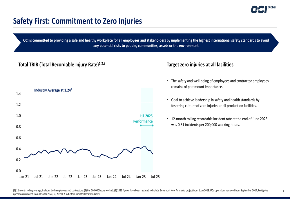 A OCI relatou uma Taxa de Lesões Registráveis Total (TRIR) de 0,31 incidentes por 200.000 horas trabalhadas no final de junho de 2025, comparada a uma média da indústria de 1,24, demonstrando o compromisso da empresa com a segurança no local de trabalho mesmo durante sua significativa transformação organizacional.