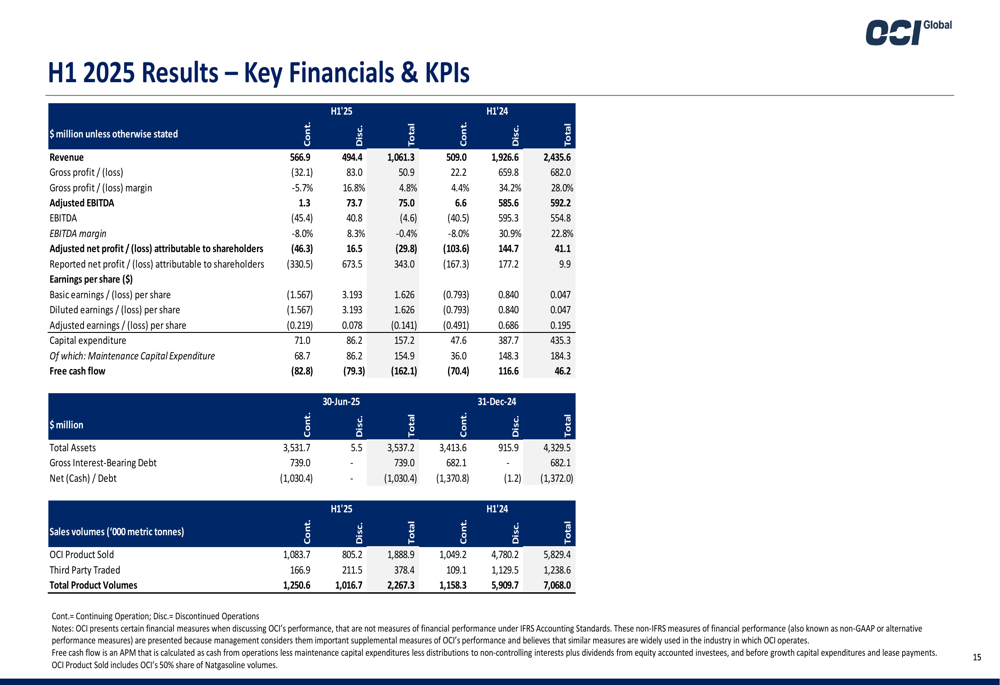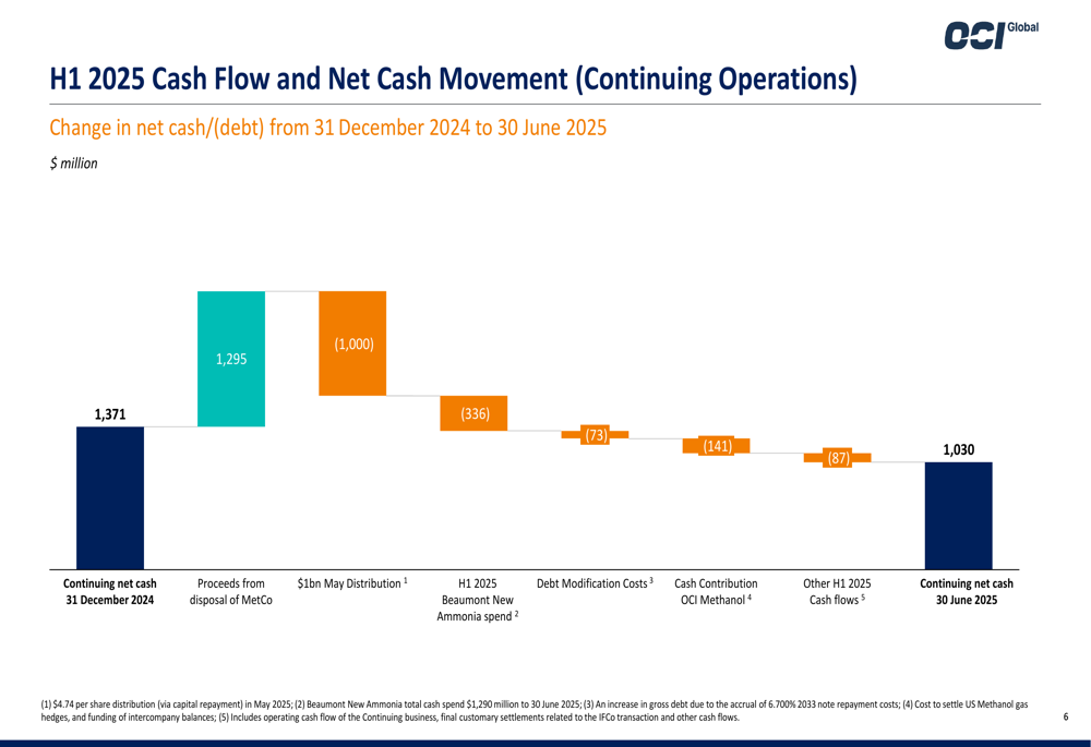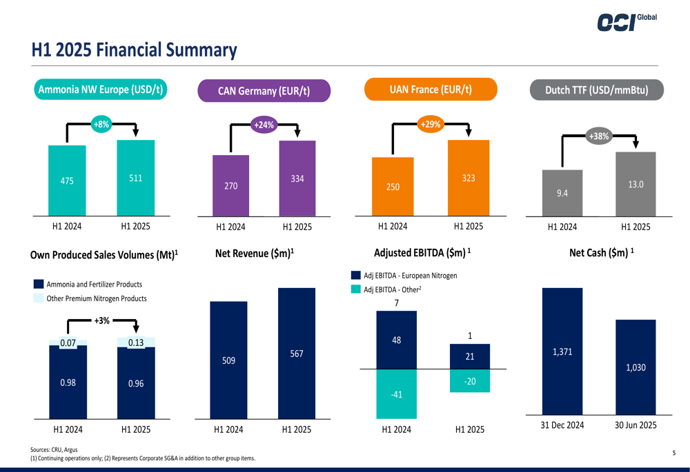Os resultados financeiros do 1º semestre de 2025 da OCI mostraram desempenho misto, com receita de operações continuadas aumentando para US$ 567 milhões, de US$ 509 milhões no 1º semestre de 2024, representando um crescimento de 11,4% ano a ano.