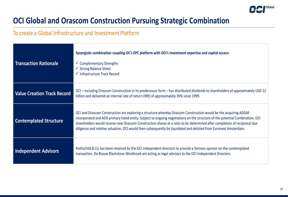 Esta potencial transação criaria uma Plataforma Global de Infraestrutura e Investimento, combinando as capacidades de EPC (Engenharia, Aquisição e Construção) da OC com a expertise de investimento e acesso a capital da OCI. A estrutura sendo explorada teria a Orascom Construction como a entidade adquirente, com os acionistas da OCI recebendo novas ações da Orascom Construction em uma proporção a ser determinada. A OCI seria subsequentemente liquidada e deslistada da Euronext Amsterdã.