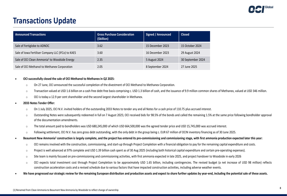 A transação mais recente, a venda da OCI Methanol para a Methanex Corporation por US$ 2,05 bilhões, foi concluída no 2º tri de 2025, resultando na OCI se tornando acionista de 12,9% da Methanex. Isso segue desinvestimentos anteriores da Fertiglobe para a ADNOC (US$ 3,62 bilhões), Iowa Fertilizer Company para a KAES (US$ 3,60 bilhões) e OCI Clean Ammonia para a Woodside Energy (US$ 2,35 bilhões).