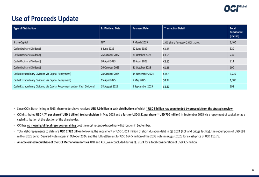 Desde 2013, a OCI retornou US$ 7,0 bilhões aos acionistas, com aproximadamente US$ 5 bilhões financiados por receitas da revisão estratégica. Distribuições recentes incluem US$ 4,74 por ação em maio de 2025 e US$ 3,31 por ação em setembro de 2025.