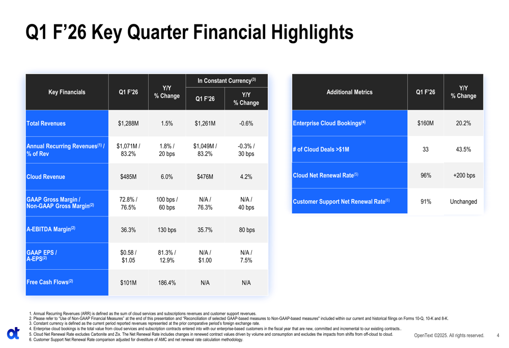 A OpenText reportou receitas totais de US$ 1,29 bilhão para o 1º tri F’26, representando um aumento de 1,5% em relação ao ano anterior. A receita em nuvem foi um ponto particularmente positivo, crescendo 6,0% para US$ 485 milhões. As receitas recorrentes anuais (ARR) atingiram US$ 1,07 bilhão, um aumento de 1,8% e representando 83,2% da receita total. A empresa melhorou significativamente seu fluxo de caixa livre, que aumentou 186,4% para US$ 101 milhões.