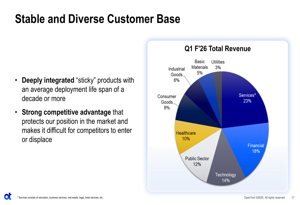 A administração da OpenText destacou que seus produtos são "profundamente integrados" e "aderentes", com uma vida útil média de implantação de uma década ou mais, criando uma forte vantagem competitiva que protege sua posição de mercado.
