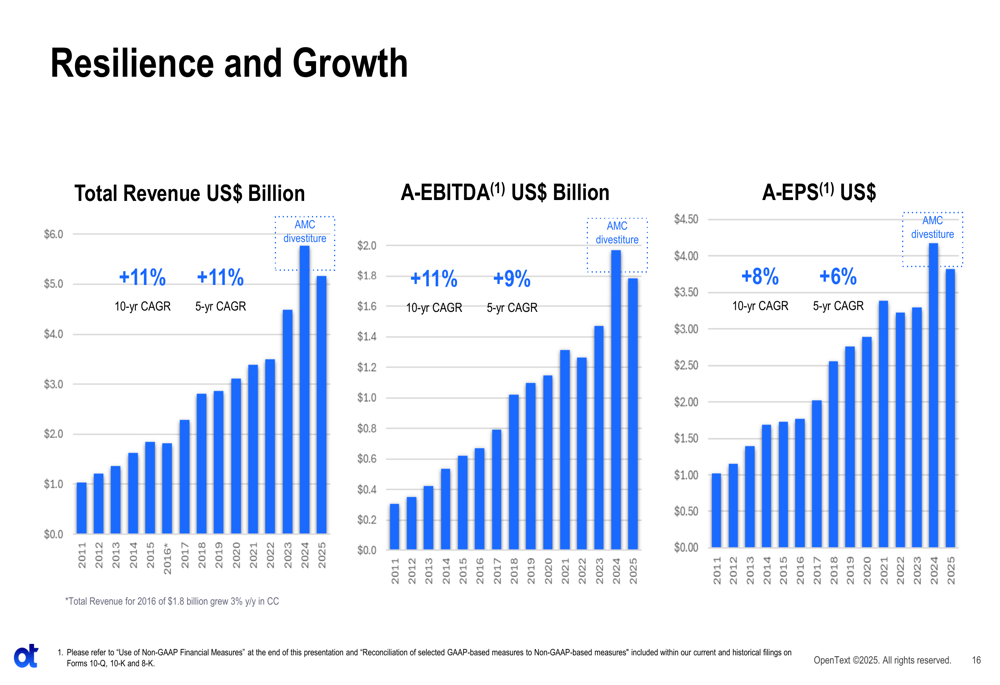 A OpenText enfatizou seu histórico de resiliência e crescimento na última década, destacando a capacidade da empresa de crescer consistentemente em receita, EBITDA ajustado e LPA ajustado: