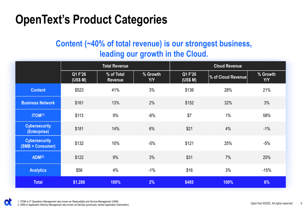 Um tema central da apresentação da OpenText foi sua reorientação estratégica em quatro negócios principais: Conteúdo (conteúdo gerado por humanos), ITOM (conteúdo gerado por máquinas), Business Network (conteúdo entre organizações) e Cybersecurity (que envolve os outros três). Isso representa uma mudança da abordagem anterior de portfólio mais amplo da empresa.