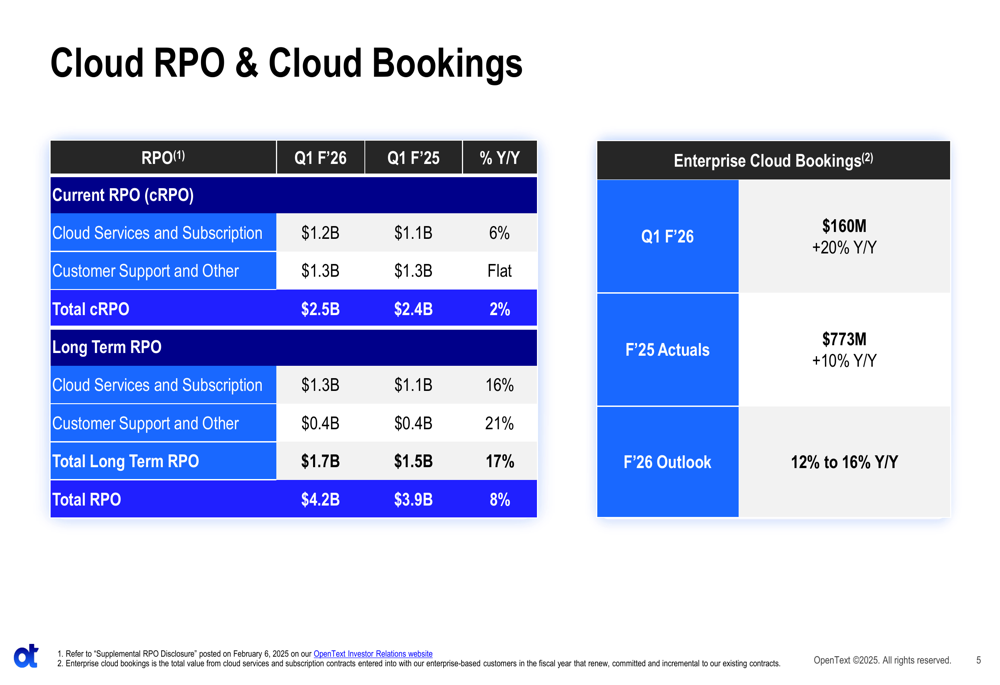 As obrigações de desempenho remanescentes (RPO) da OpenText demonstram impulso contínuo em seu negócio de nuvem, com RPO total crescendo 8% ano a ano para US$ 4,2 bilhões: