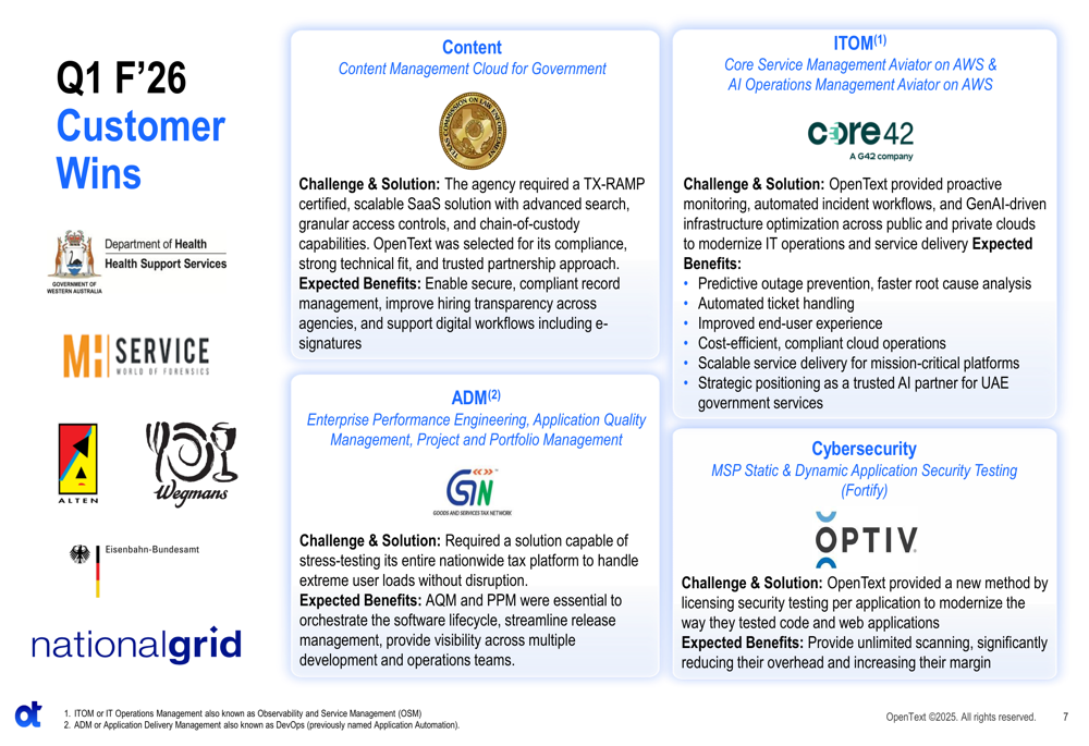 A empresa destacou várias conquistas significativas de clientes em suas categorias de produtos, incluindo agências governamentais e clientes corporativos implementando soluções de gerenciamento de conteúdo, gerenciamento de operações de TI, desenvolvimento de aplicativos e cybersecurity da OpenText: