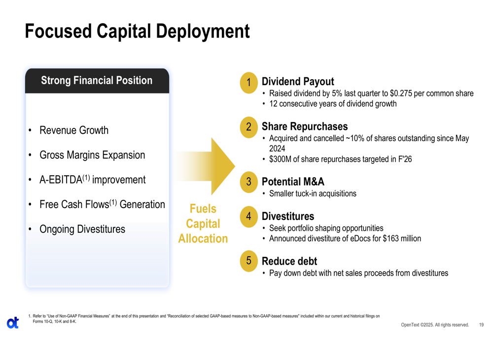 A OpenText aumentou seu dividendo trimestral em 5% para US$ 0,275 por ação, marcando o 12º ano consecutivo de crescimento de dividendos. A empresa também tem recomprado ações ativamente, tendo adquirido e cancelado aproximadamente 10% das ações em circulação desde maio de 2024, com US$ 300 milhões adicionais em recompras de ações previstas para o ano fiscal de 2026.