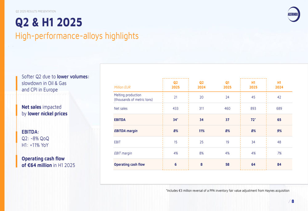 Enquanto isso, o segmento de ligas de alto desempenho (HPA) experimentou um 2º tri mais fraco devido a volumes menores, particularmente nos setores de petróleo e gás e indústrias de processos químicos na Europa. O EBITDA do segmento diminuiu 8% em relação ao 1º tri para €34 milhões, embora o desempenho do primeiro semestre tenha permanecido 11% acima do ano anterior.