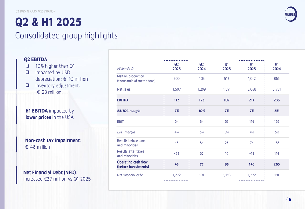 A Acerinox reportou um EBITDA de €112 milhões no 2º tri 2025, representando uma melhora de 10% em relação ao 1º tri, apesar das fracas condições de mercado. No entanto, esse valor foi 10,4% menor que os €125 milhões reportados no 2º tri 2024. As vendas líquidas atingiram €1.507 milhões no 2º tri 2025, um aumento de 16% em relação ao mesmo período do ano anterior, enquanto as vendas do primeiro semestre totalizaram €3.058 milhões.