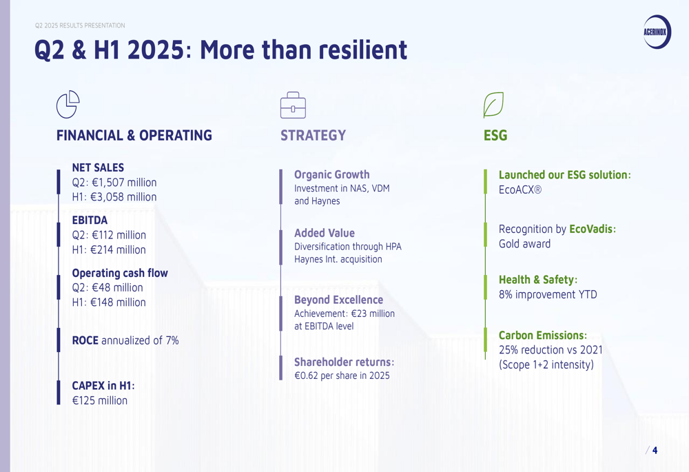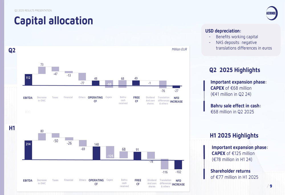O CAPEX da empresa atingiu €68 milhões no 2º tri e €125 milhões no primeiro semestre, significativamente maior que o ano anterior, à medida que a Acerinox entrou no que descreveu como uma "importante fase de expansão". A venda das operações da Bahru contribuiu com €68 milhões em caixa durante o 2º tri, enquanto os retornos aos acionistas totalizaram €77 milhões no primeiro semestre de 2025.