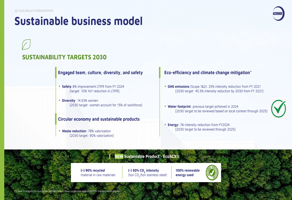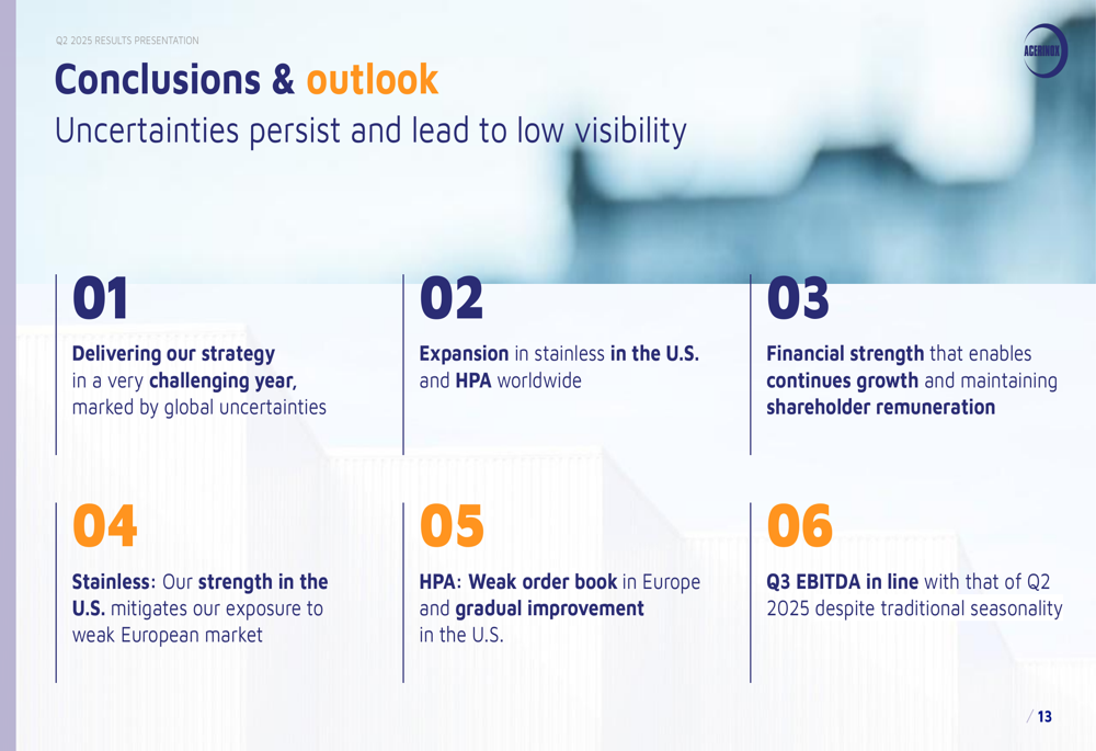 Olhando para o futuro, a Acerinox espera que o EBITDA do 3º tri 2025 esteja em linha com o desempenho do 2º tri, apesar da tradicional fraqueza sazonal no terceiro trimestre. A empresa enfatizou sua estratégia de "controlar o controlável" enquanto navega pelas incertezas macroeconômicas e de política comercial.