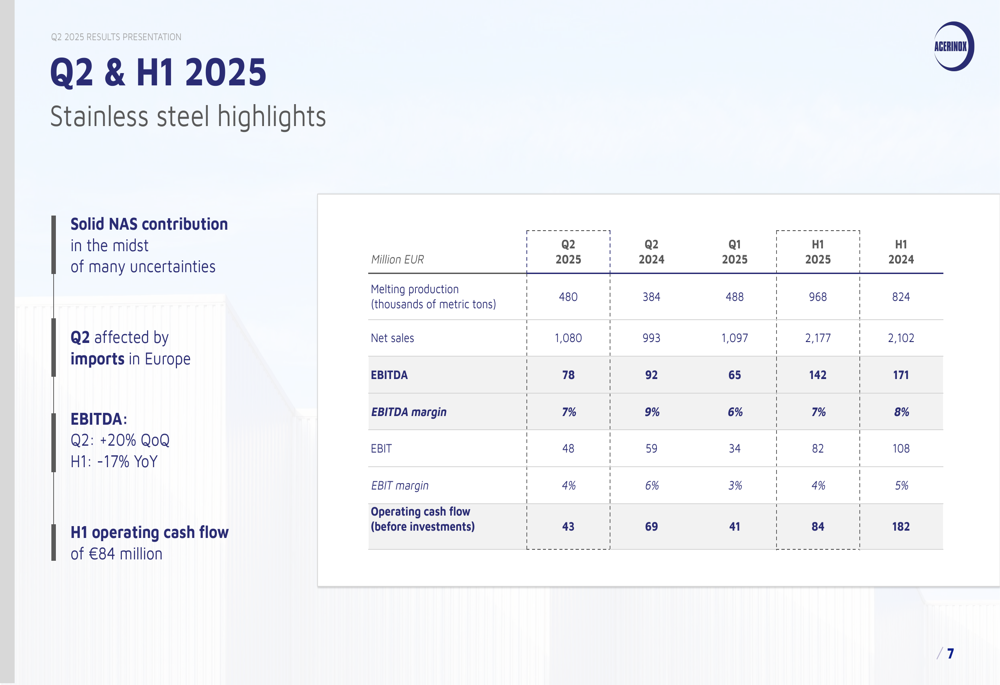 O segmento de aço inoxidável da Acerinox mostrou melhora no 2º tri apesar dos contínuos desafios de mercado. O EBITDA do segmento aumentou 20% em relação ao trimestre anterior, chegando a €78 milhões, embora tenha permanecido 15% abaixo dos €92 milhões alcançados no 2º tri 2024. A empresa citou a sólida contribuição de suas operações na North American Stainless (NAS), que ajudou a compensar a fraqueza do mercado europeu.