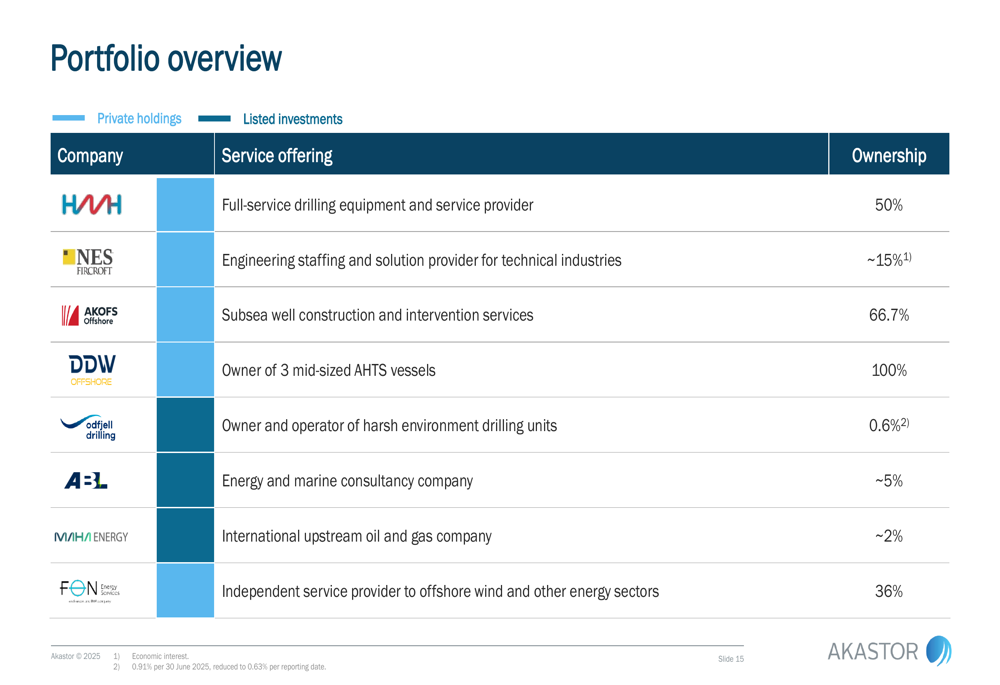 O diversificado portfólio de empresas relacionadas à energia da Akastor a posiciona para se beneficiar do crescimento esperado nos mercados offshore, particularmente à medida que os clientes continuam a investir em atualizações de plataformas. O portfólio da empresa abrange equipamentos de perfuração, pessoal de engenharia, serviços submarinos e operações de embarcações: