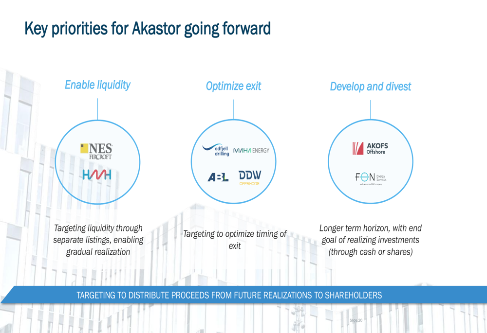 O slide a seguir ilustra as prioridades estratégicas da Akastor para suas empresas de portfólio: