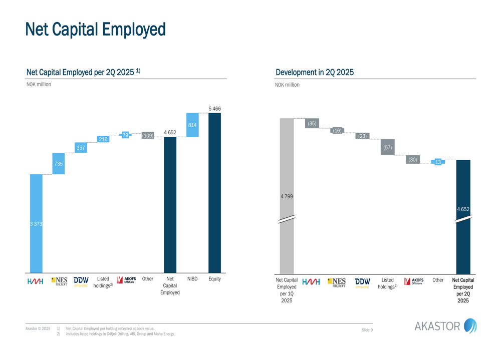 O capital empregado líquido da empresa estava em NOK 4.652 milhões em 30 de junho de 2025, com a HMH representando o maior componente em NOK 3.373 milhões. O patrimônio líquido total foi reportado em NOK 5.466 milhões.