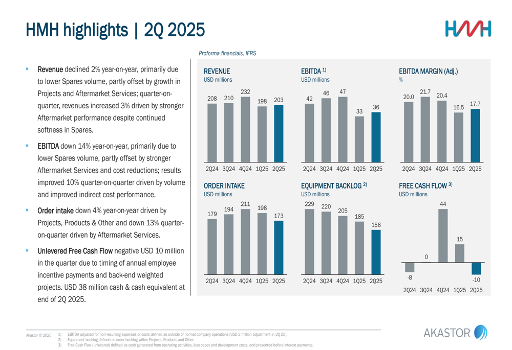 A HMH, fornecedora de equipamentos de perfuração da qual a Akastor detém 50%, manteve receitas relativamente estáveis em US$ 203 milhões, em comparação com US$ 208 milhões no 2º tri de 2024. No entanto, o EBITDA caiu para US$ 36 milhões, ante US$ 42 milhões na comparação anual, com margens contraindo de 20% para 17,7%. A empresa reportou entrada de pedidos de US$ 173 milhões, ligeiramente abaixo dos US$ 179 milhões no período comparável.