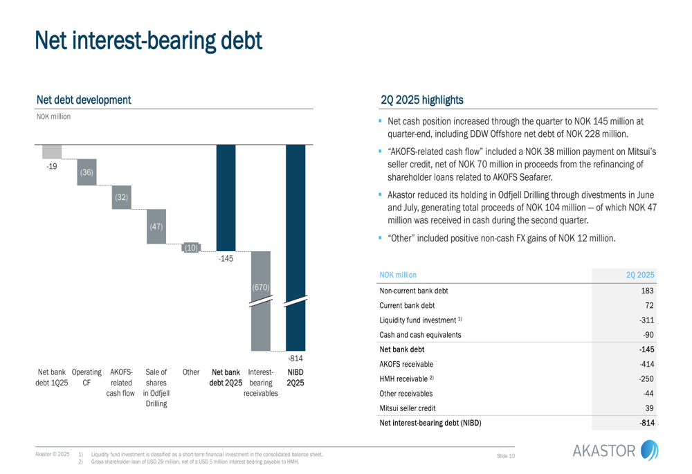 A liquidez permanece forte com caixa total disponível, investimentos em fundos e linhas não utilizadas de NOK 704 milhões. A empresa mantém uma linha de crédito rotativo de US$ 30 milhões com vencimento em junho de 2026, uma linha de financiamento de ações de NOK 70 milhões e um empréstimo a prazo para a DDW Offshore de US$ 26 milhões com vencimento em setembro de 2026.