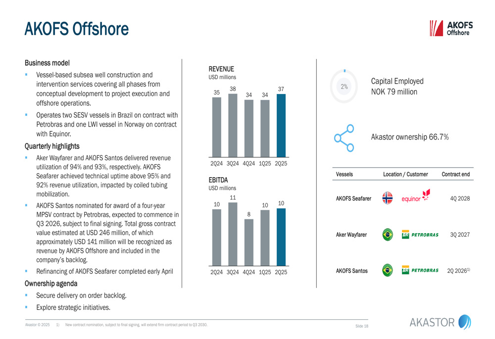 A AKOFS Offshore, na qual a Akastor detém uma participação de 66,7%, apresentou forte desempenho operacional com as embarcações Aker Wayfarer e AKOFS Santos alcançando utilização de receita de 94% e 93%, respectivamente. A empresa recebeu uma nomeação para um contrato MPSV de quatro anos com a Petrobras para a embarcação AKOFS Santos, com início previsto para o 3º tri de 2026.