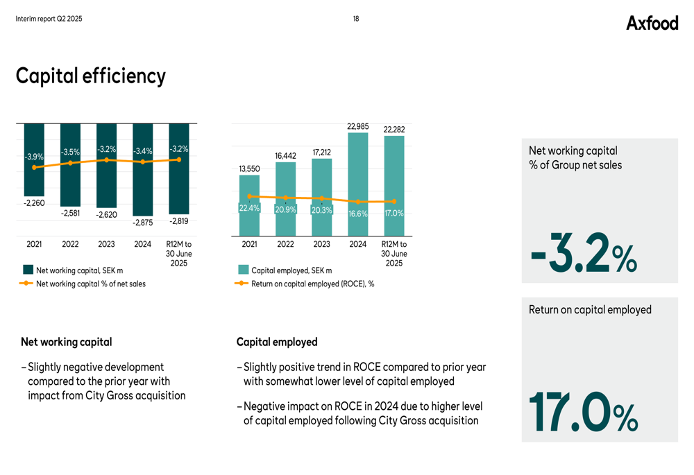 O segmento de e-commerce da empresa continuou seu forte impulso, com vendas aumentando 12,3% em comparação com o crescimento do mercado de 7,9%. Excluindo City Gross e Middagsfrid, as vendas de e-commerce cresceram 6,2%.